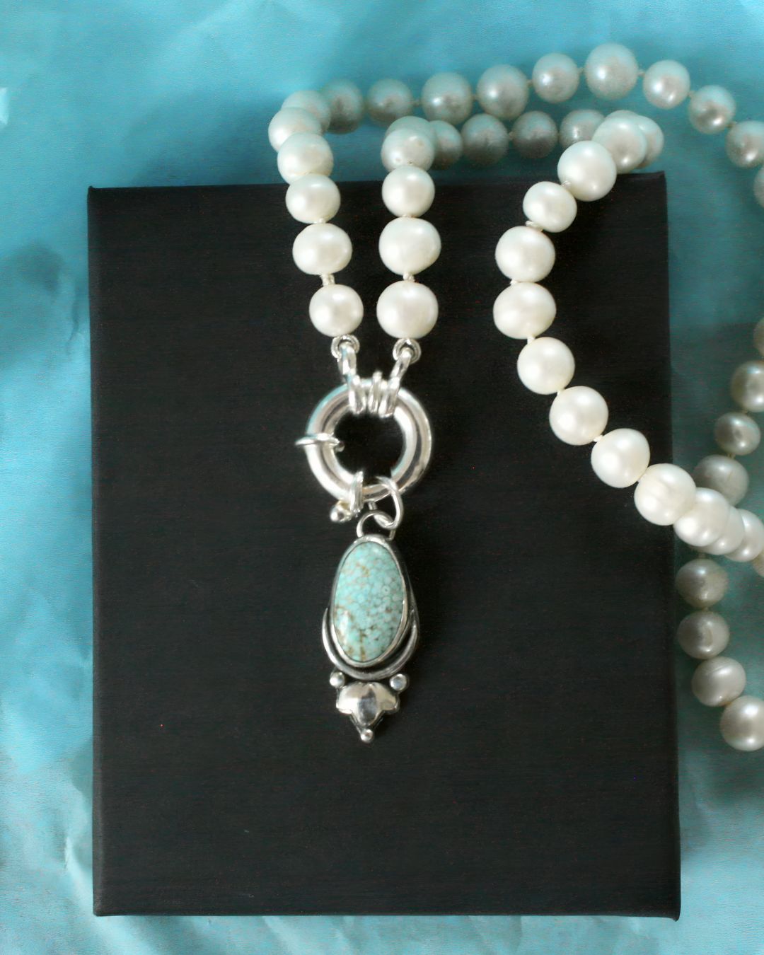 This pendant features a Number Eight Turquoise, also known as #8 Turquoise. It’s considered a vintage stone since the Nevada mine where it was originally sourced has been closed since the 1970s. This type of turquoise is highly valued for its beautiful webbed matrix and stunning blue color.