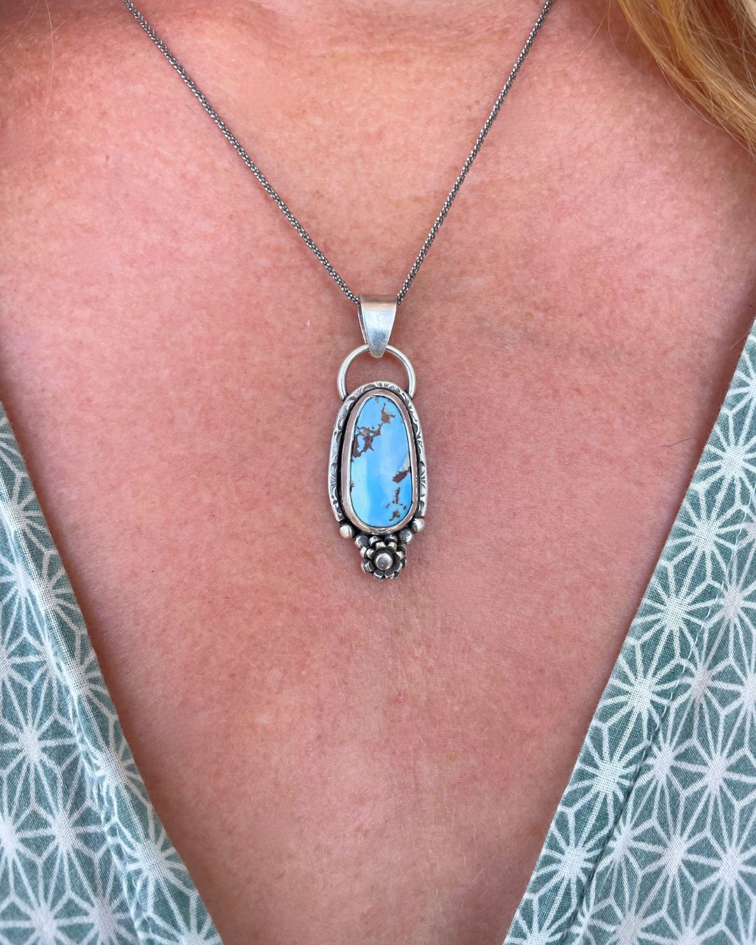 Sweet Golden Hills turquoise with a soft lavender hue, marked by its signature sharp transitions from lighter to deeper blues, fading into white… pure tenderness and emotion. As if it were painted with delicate watercolor strokes.