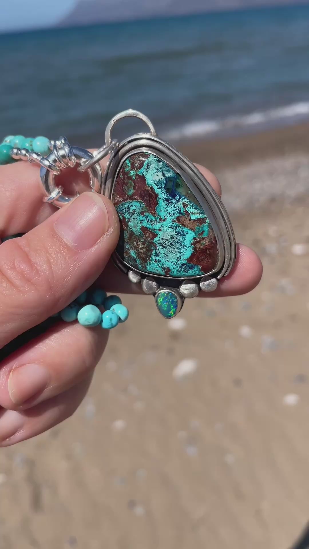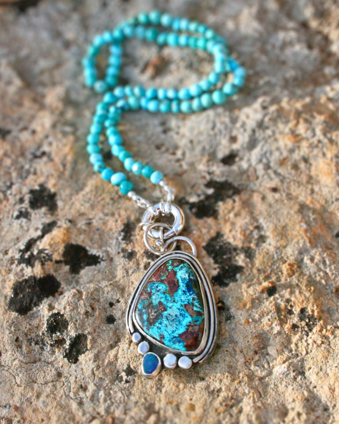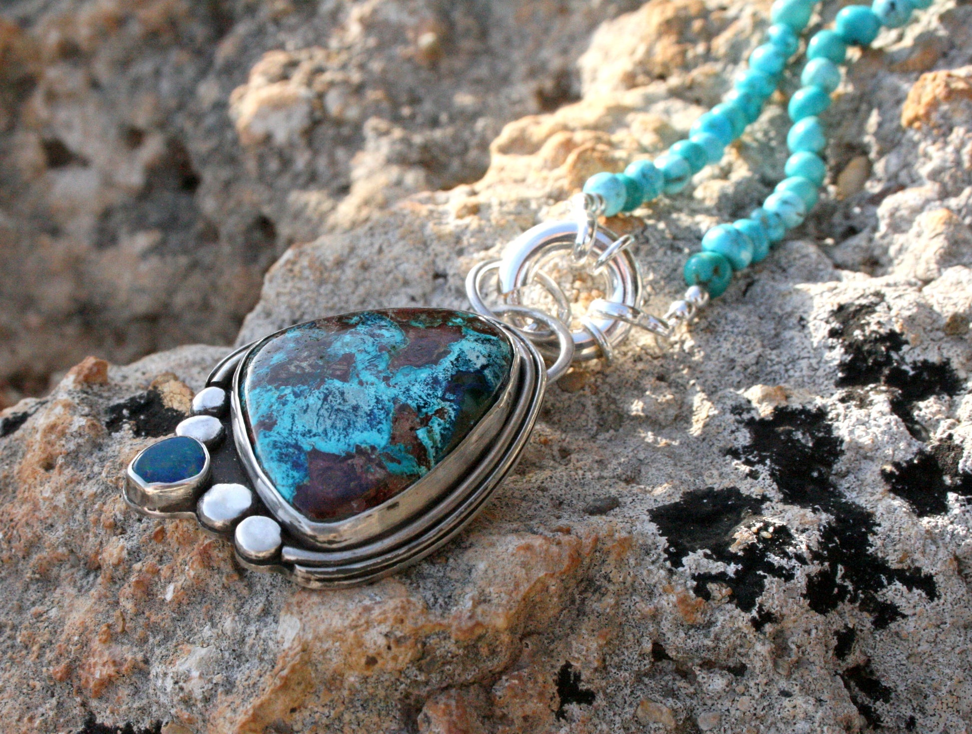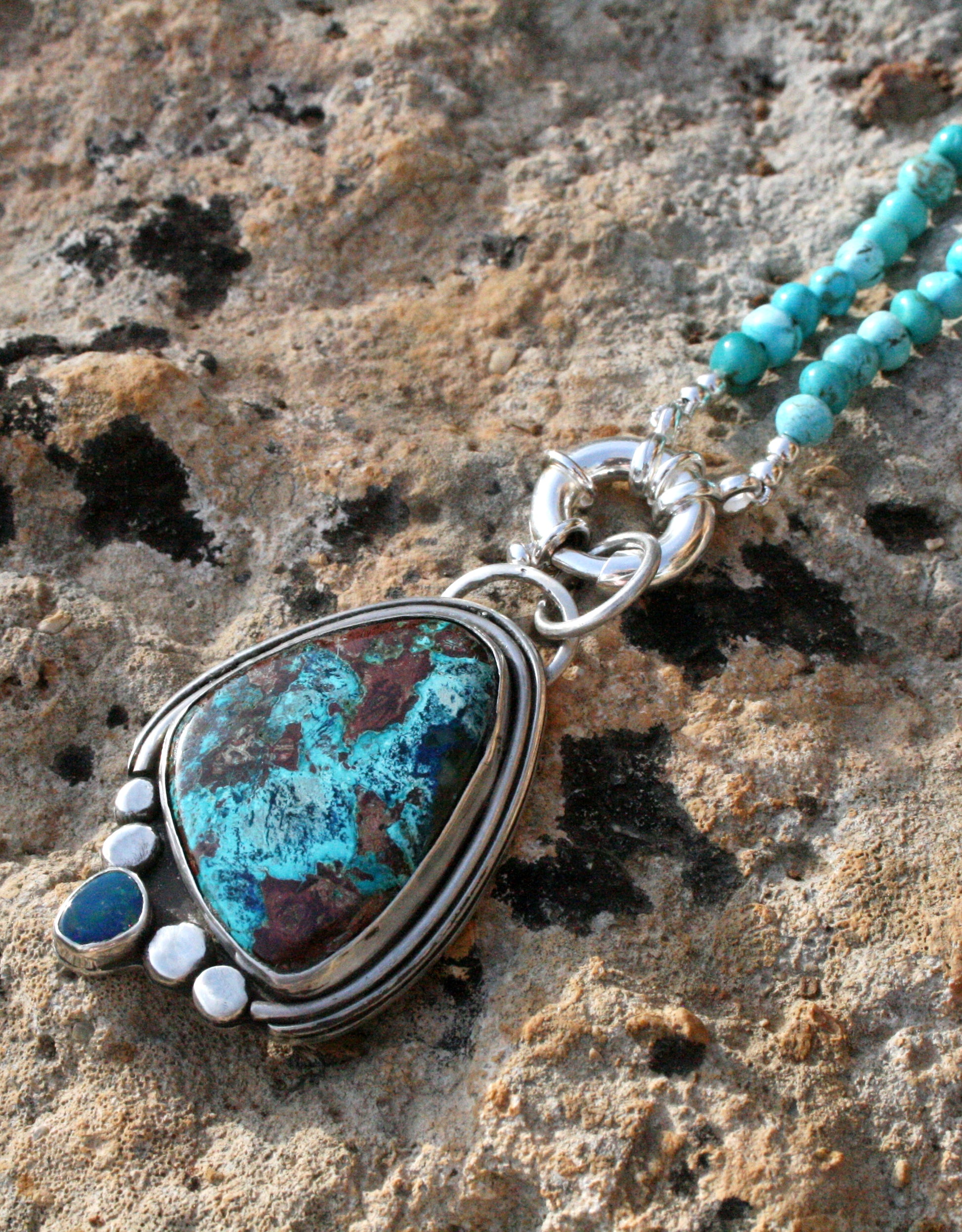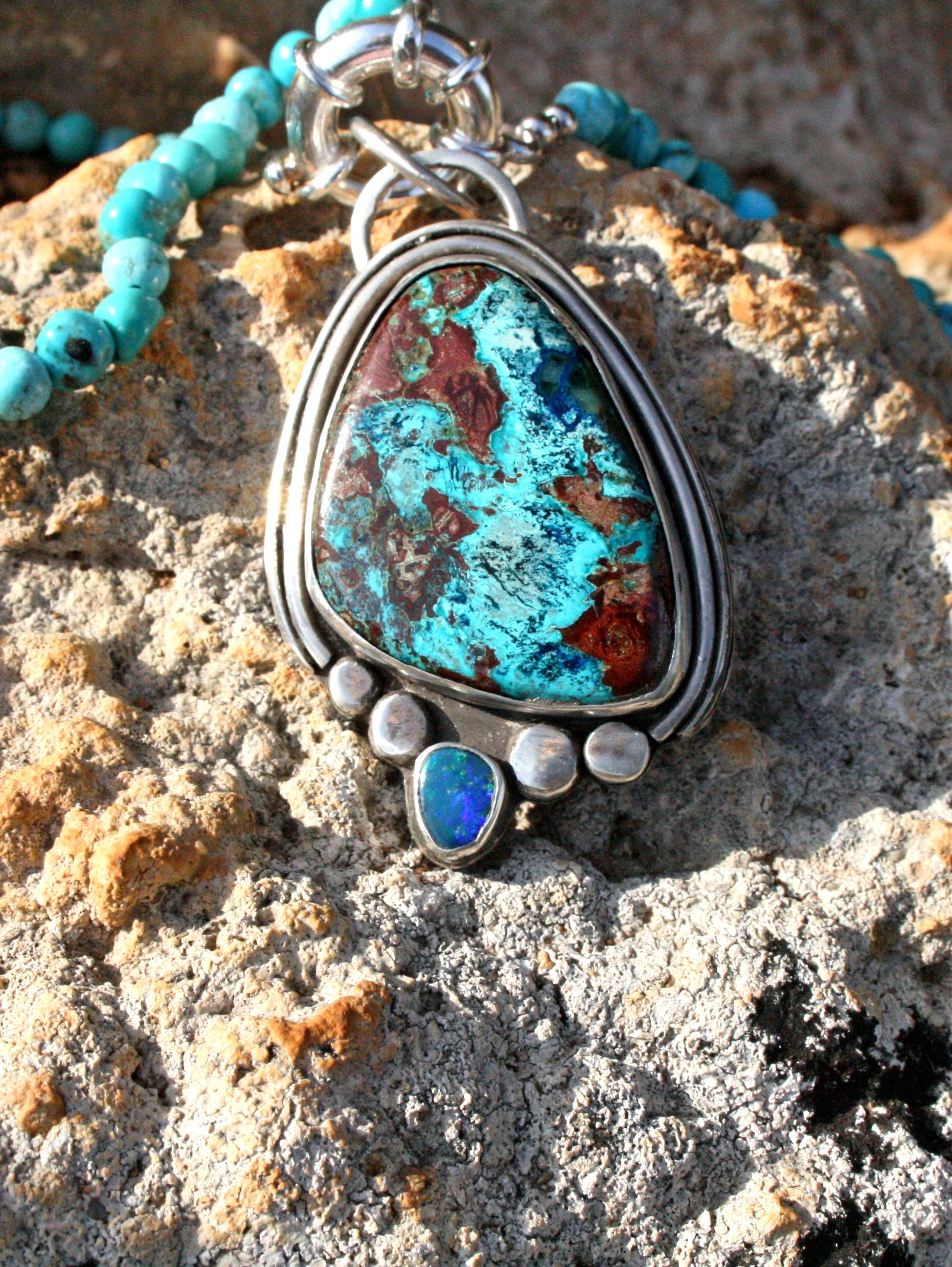 Pendant featuring Shattuckite and Australian opal – a tribute to Earth itself.