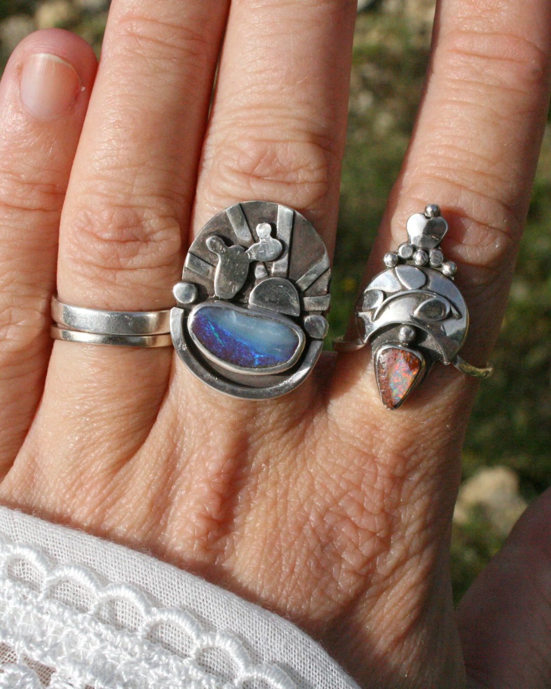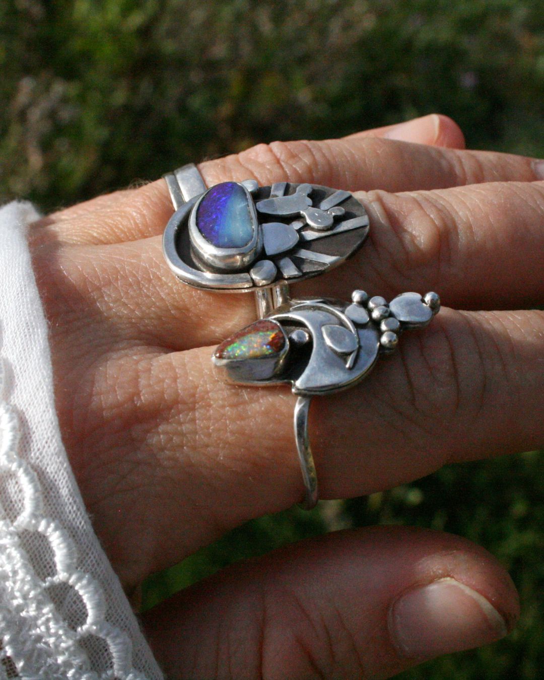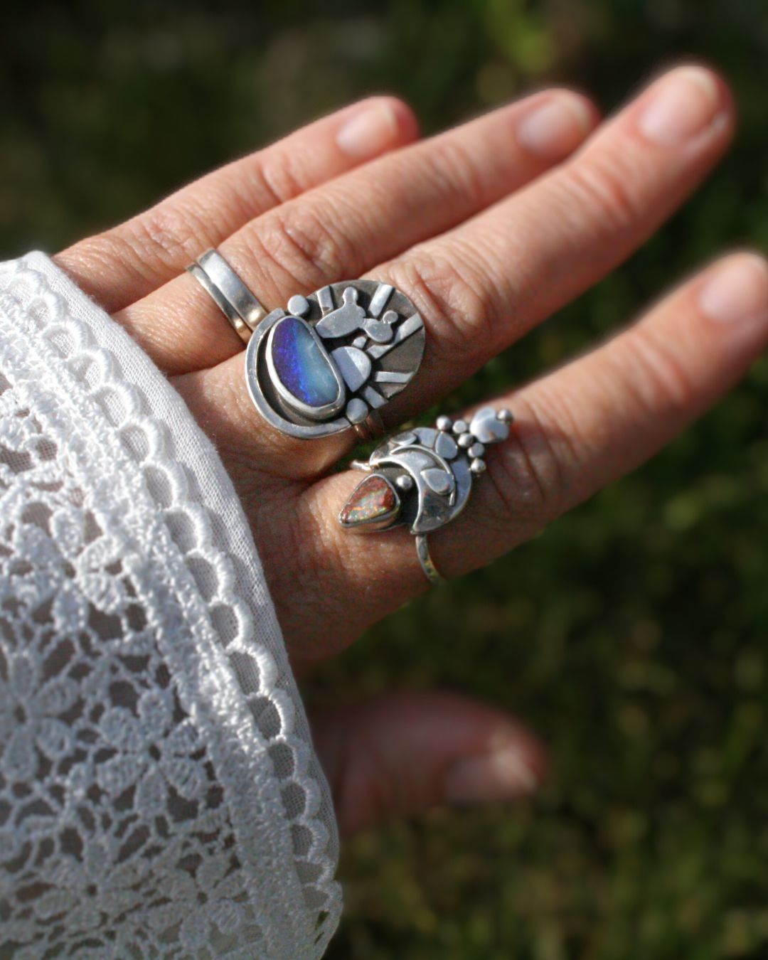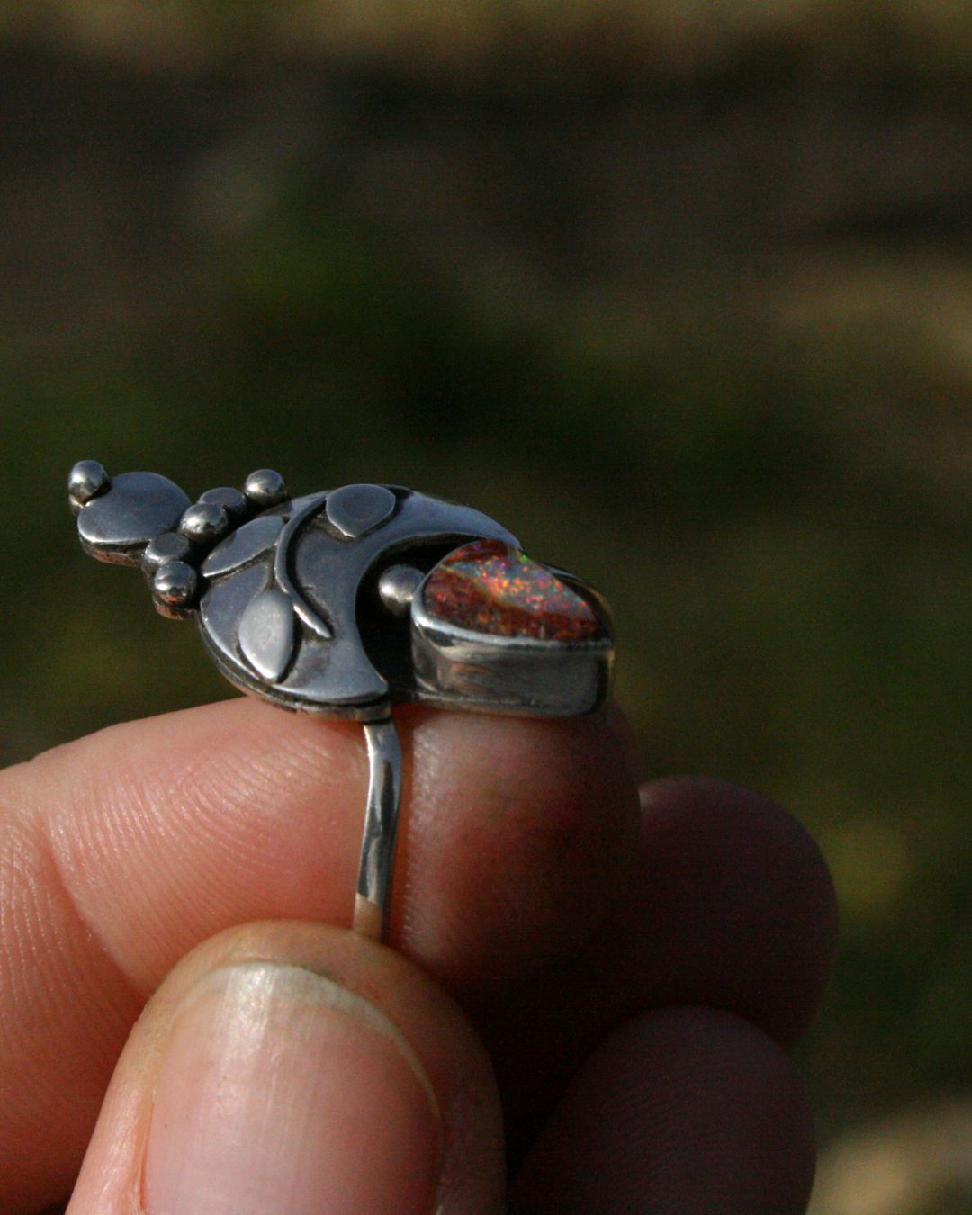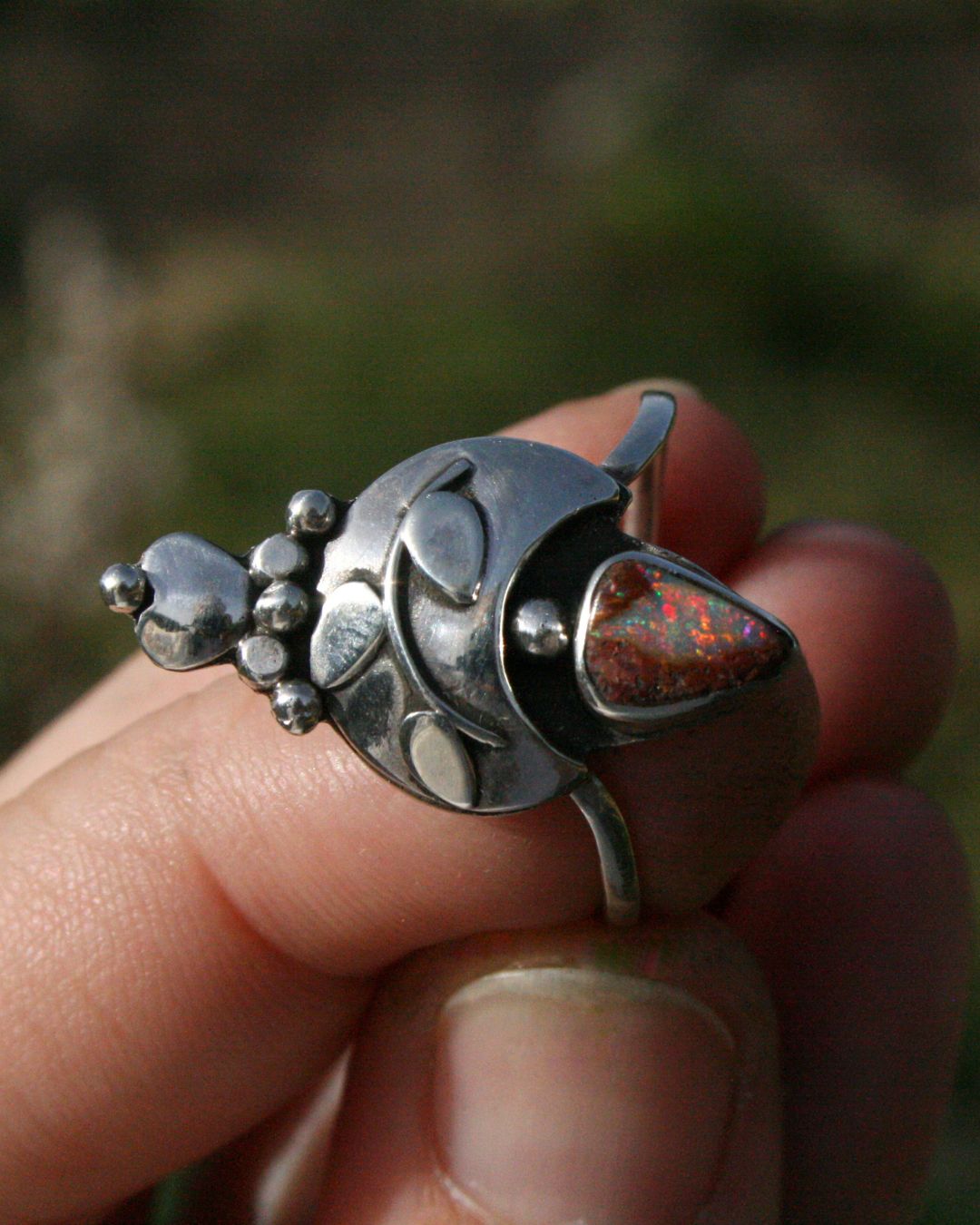 This ring showcases a dazzling Australian pipe opal that dances with every color of the rainbow, catching the light with each movement. Set in solid sterling silver, it's a one of a kind piece.