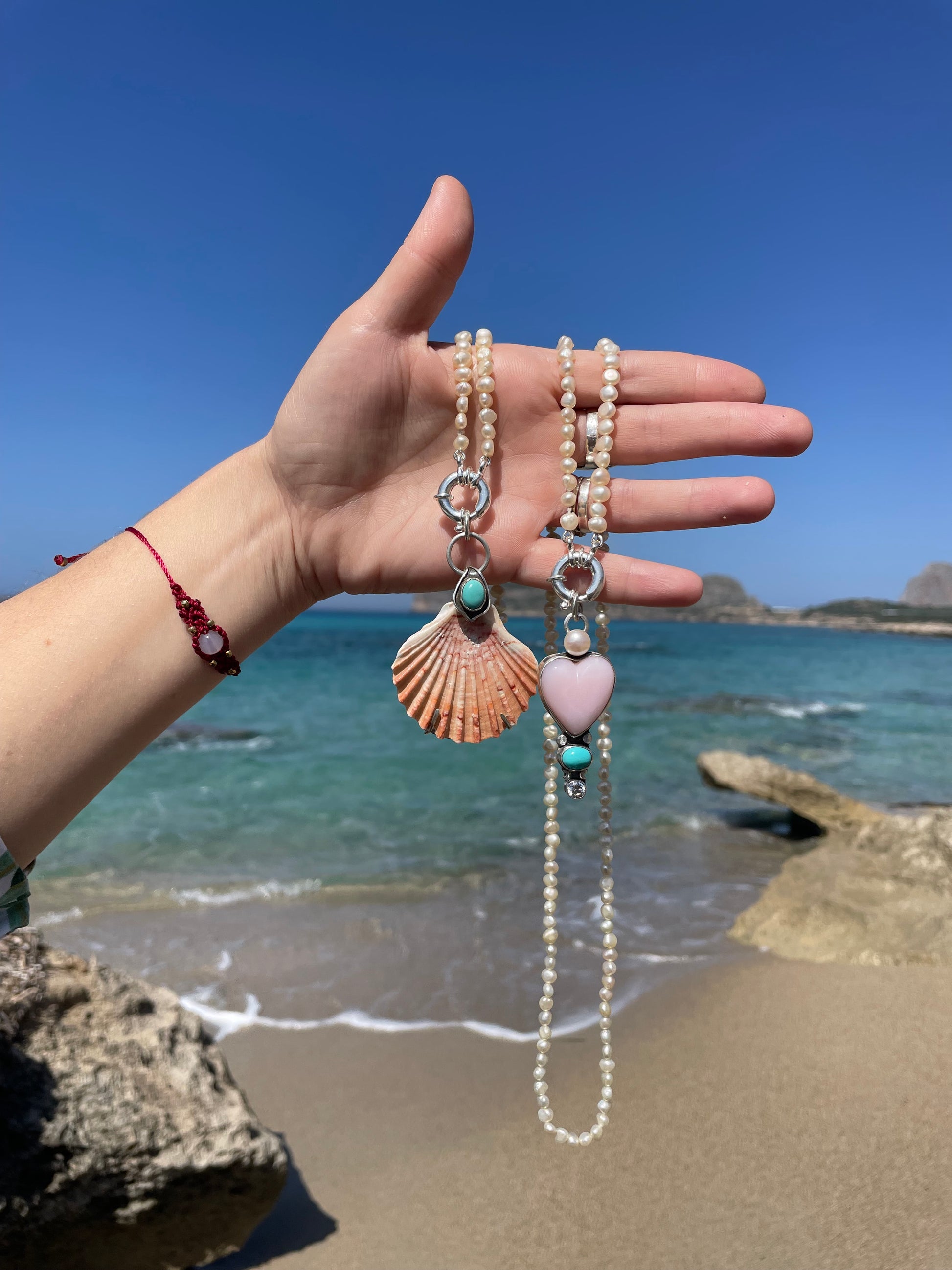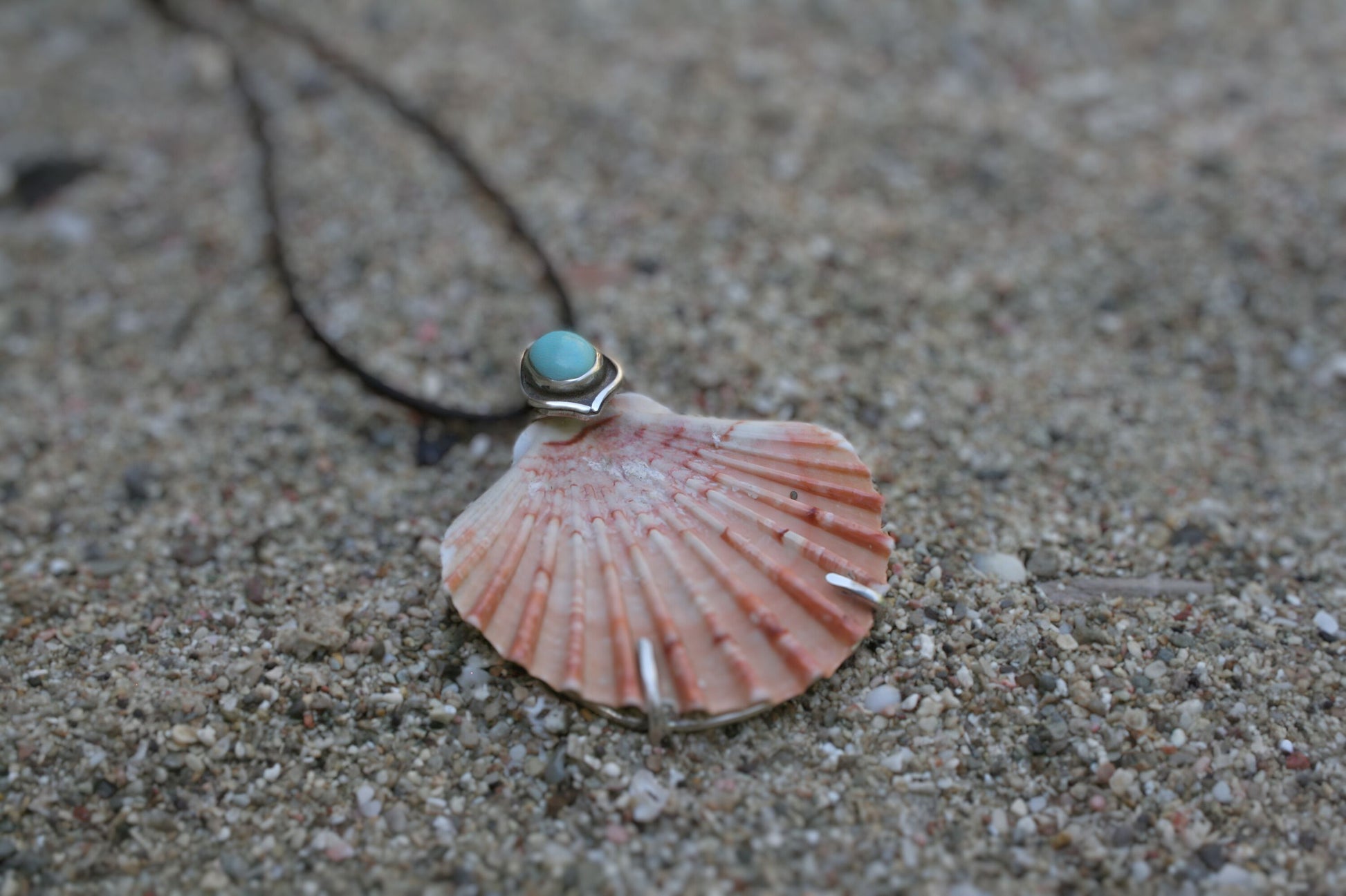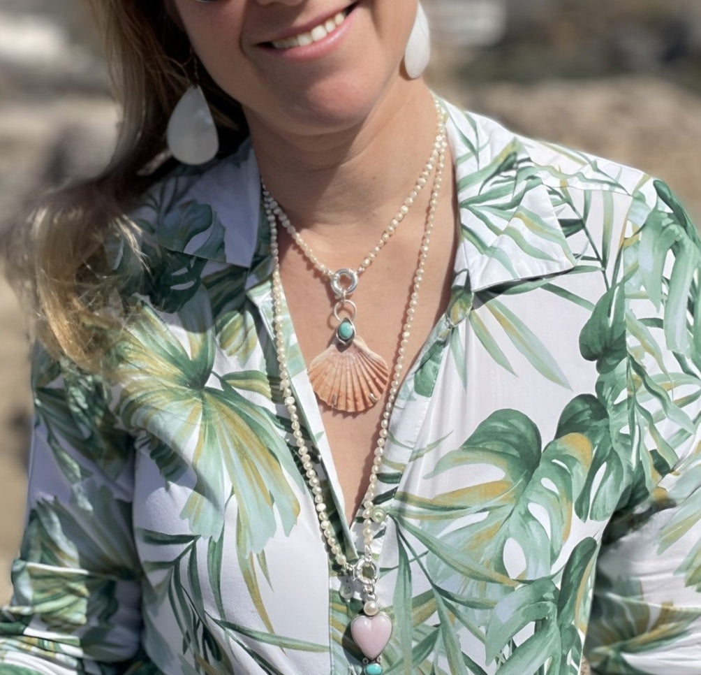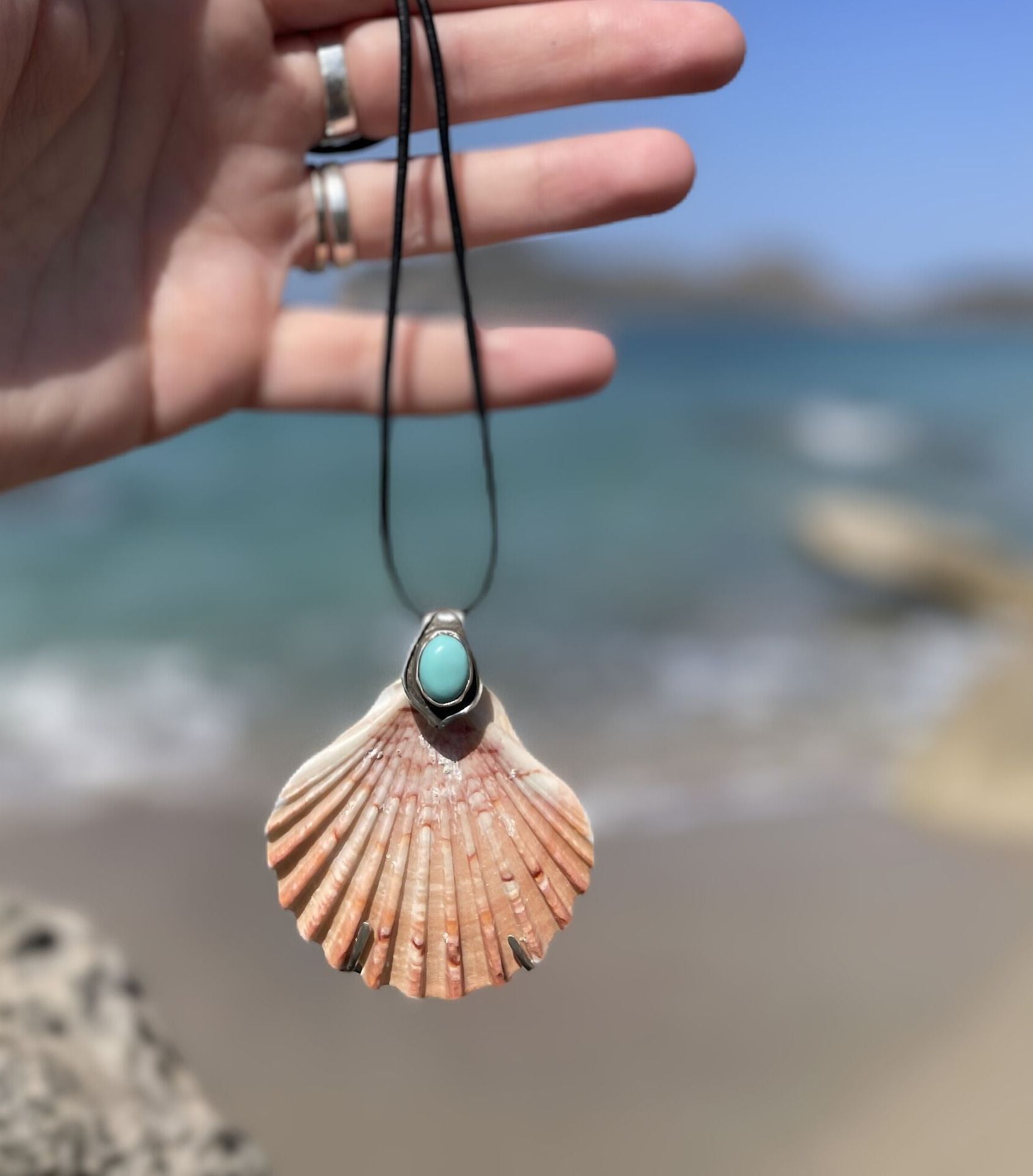 It’s made from 925 silver, Arizona turquoise from Kingman, and an unaltered shell, just as the sea created it. Its surface bears the marks of its life beneath the surface. This is intentional, so you can always carry the wild essence of the sea with you.
