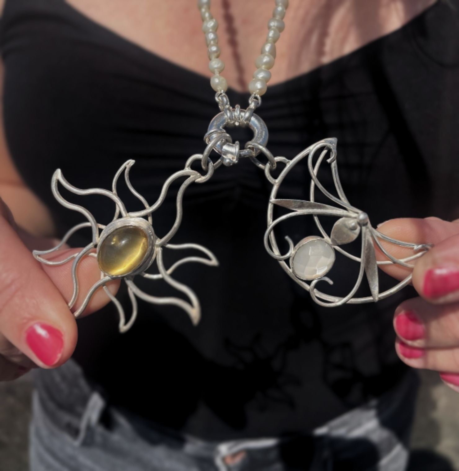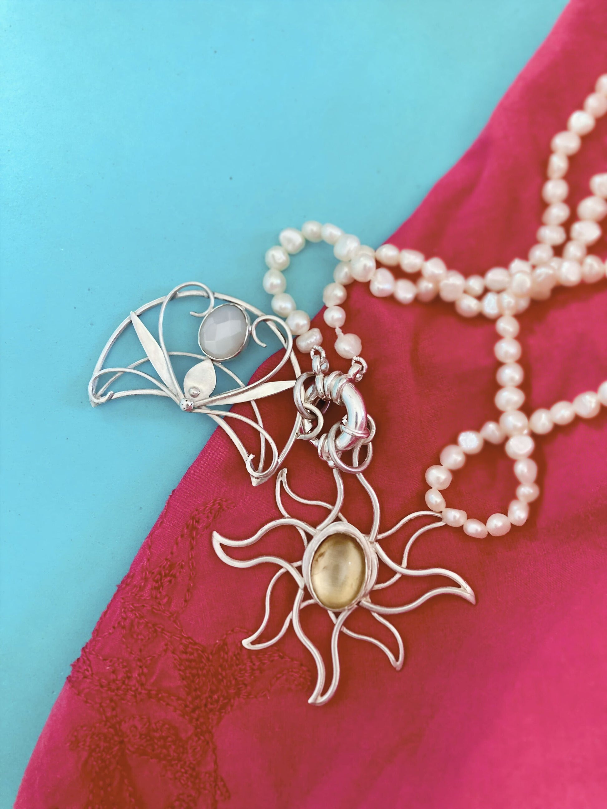 The pendants are crafted from 925 silver, featuring a rose-cut moonstone and a citrine.