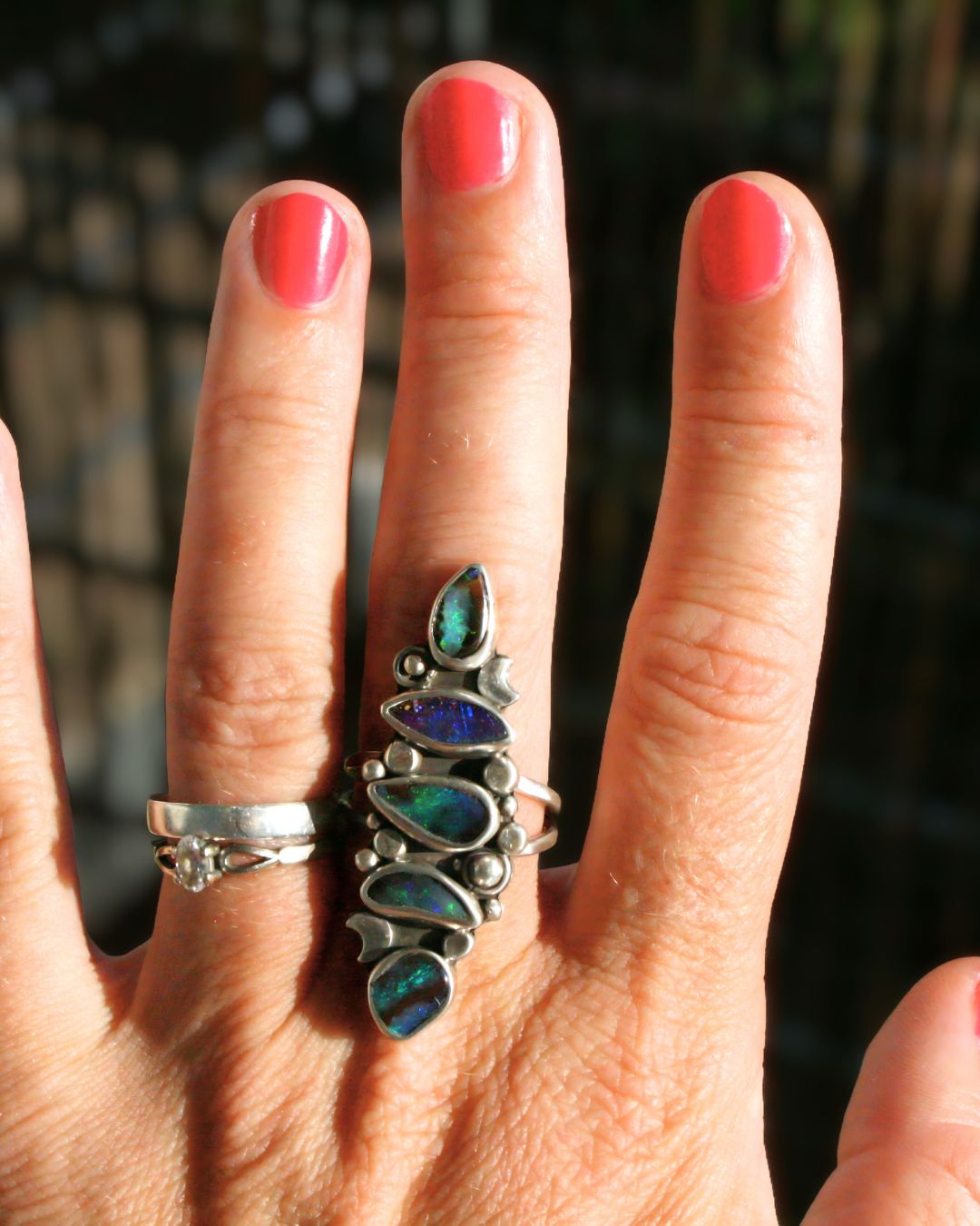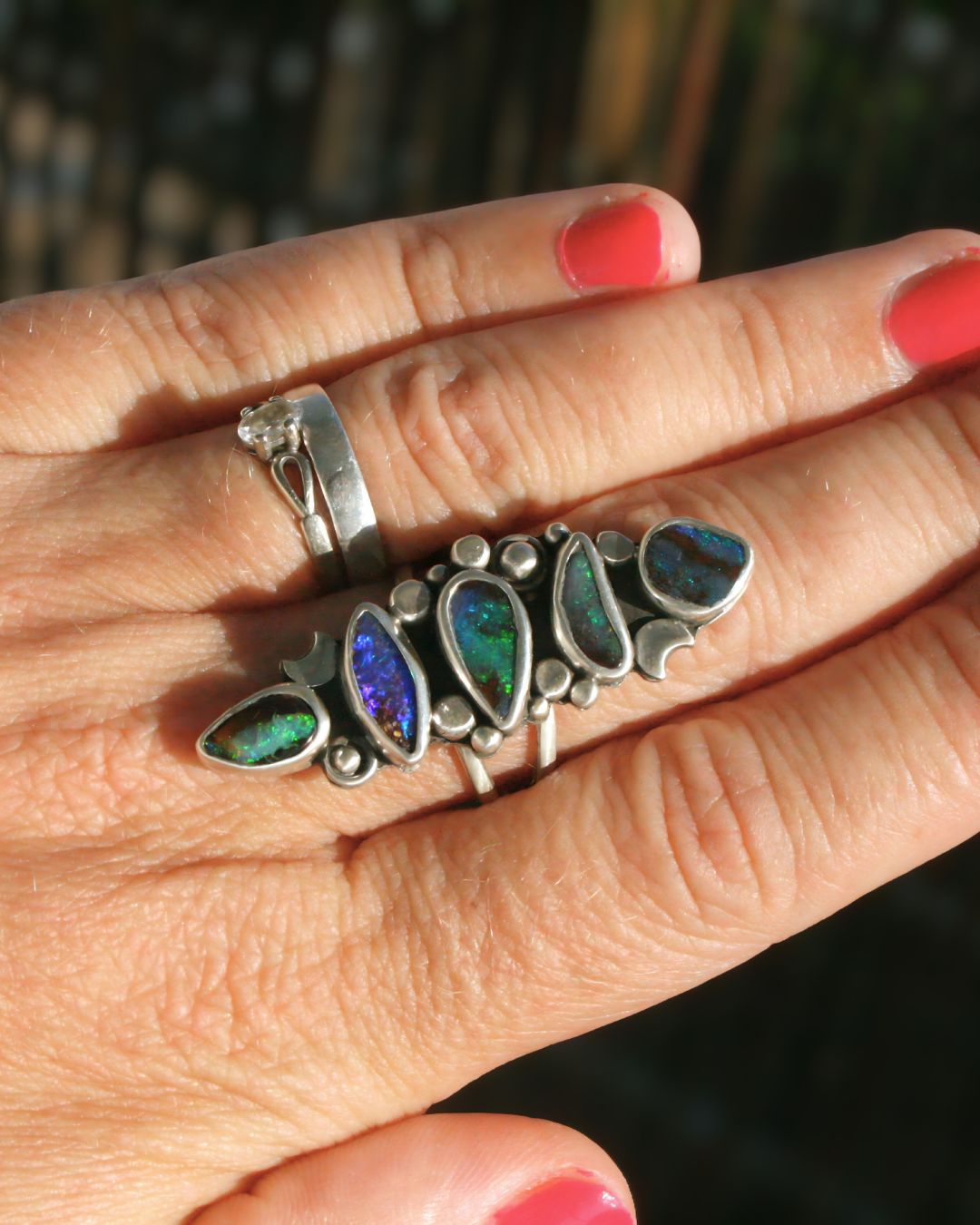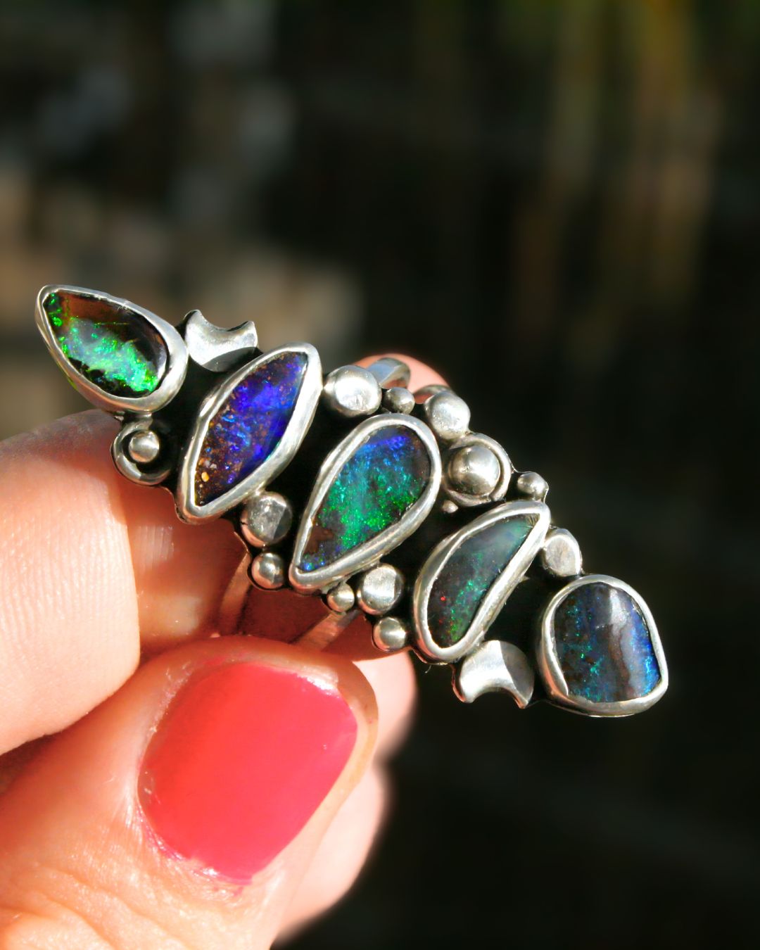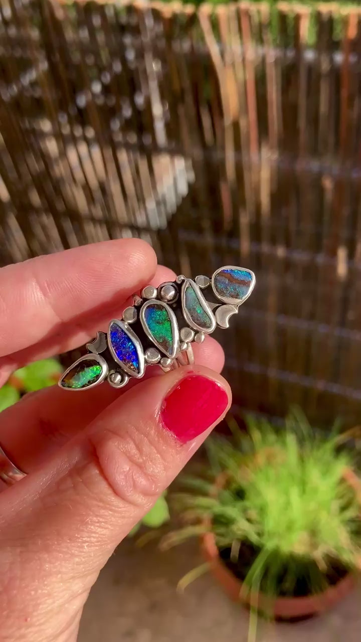 An amazing opal ring where each opal is like its own universe of colorful nebulae and stars. A ring with boulder opals that look like tiny planets, holding an entire cosmos within.