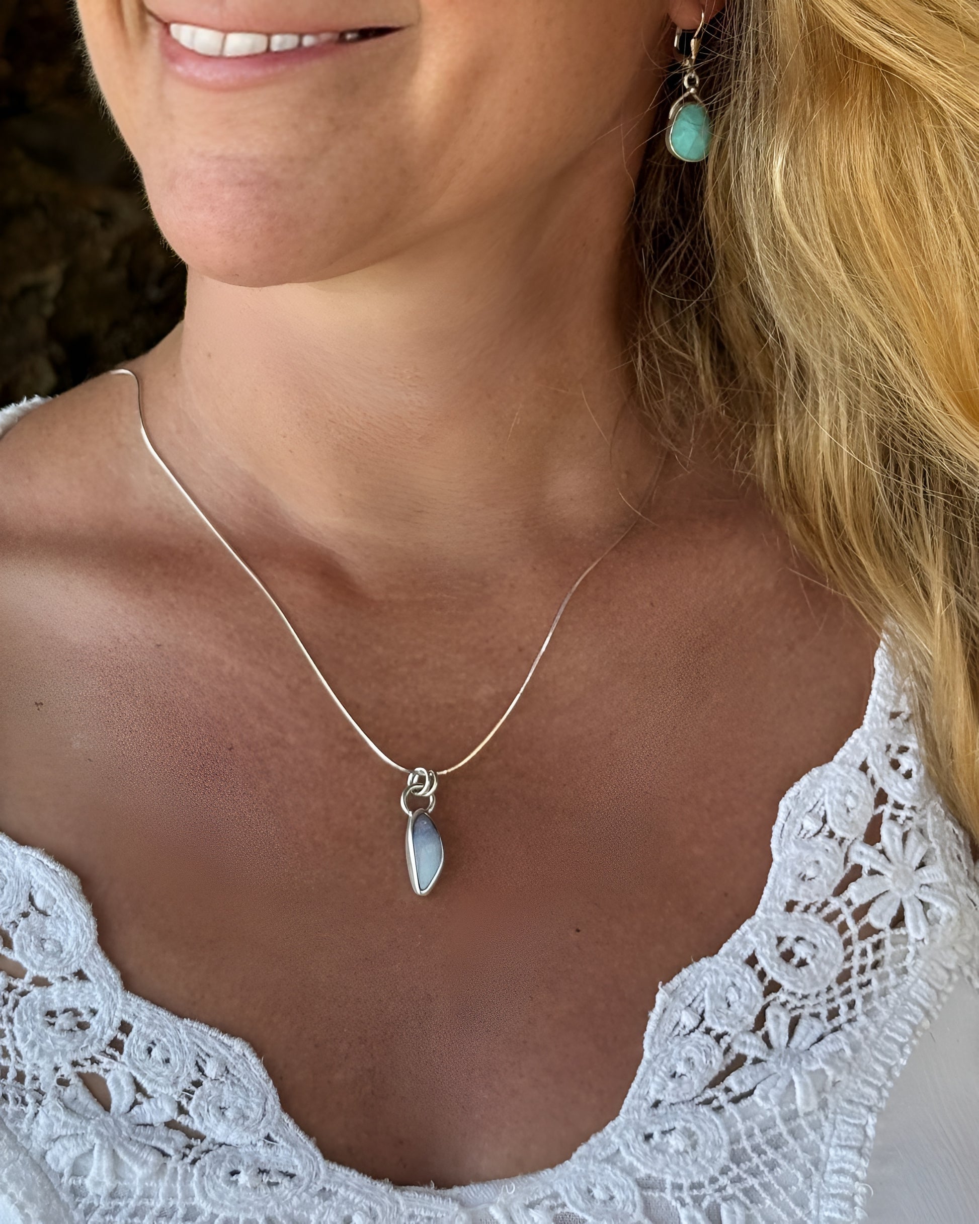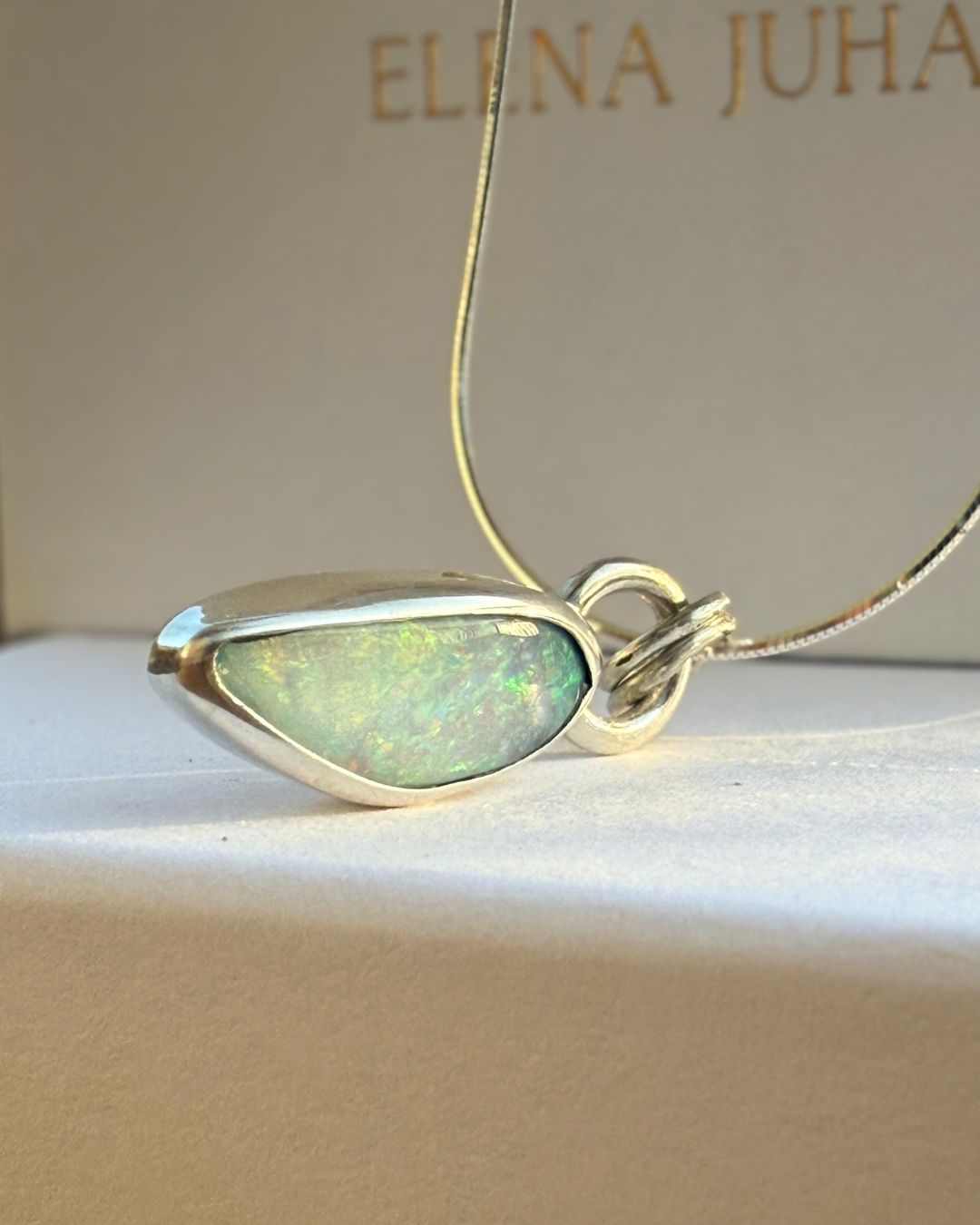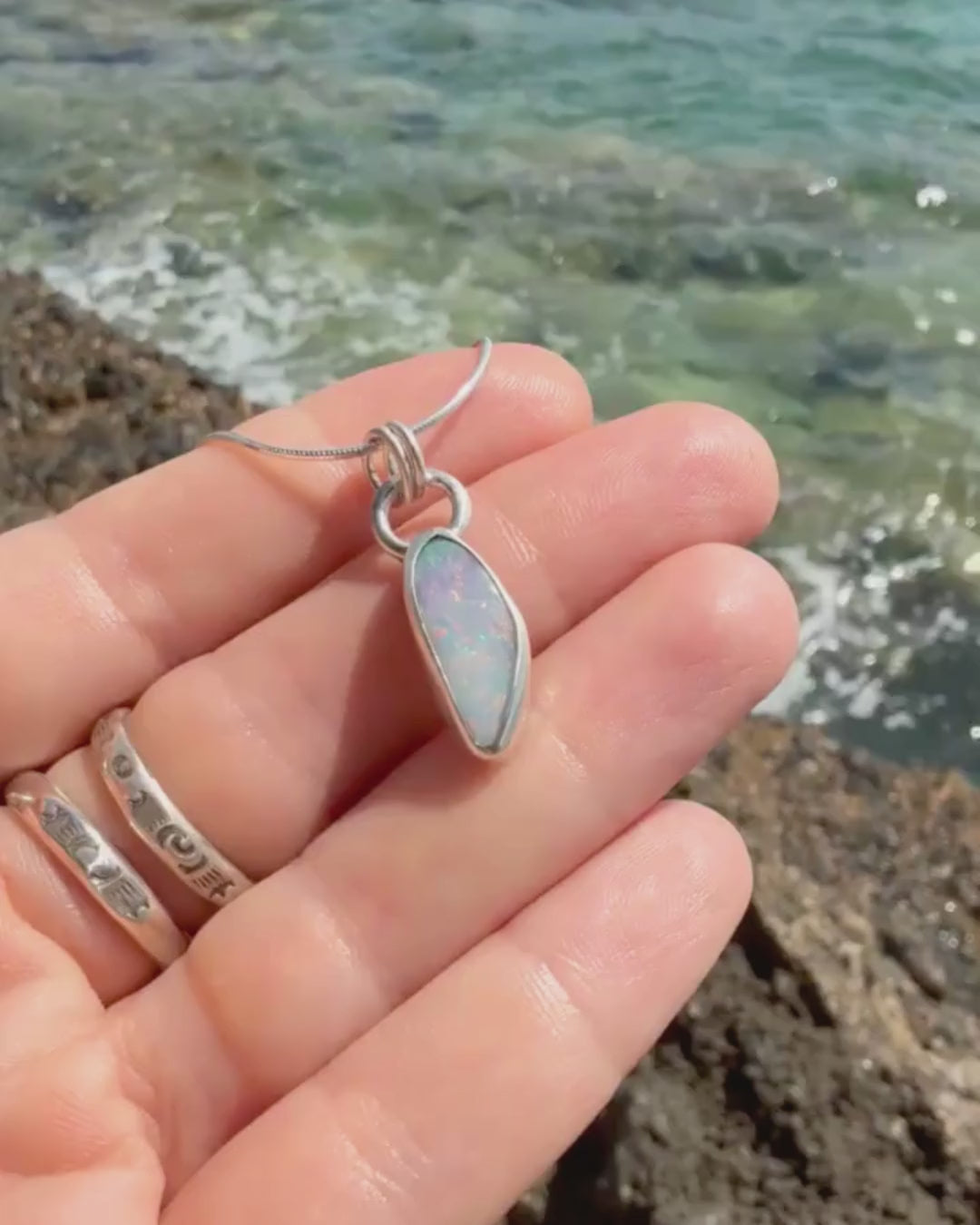 Handcrafted from solid sterling silver and natural Australian pastel boulder opal. This is a solid opal — stable and durable, just as Australian opals are known to be. It can live with you and remain just as beautiful over time. Please avoid chemicals and direct application of cosmetics.